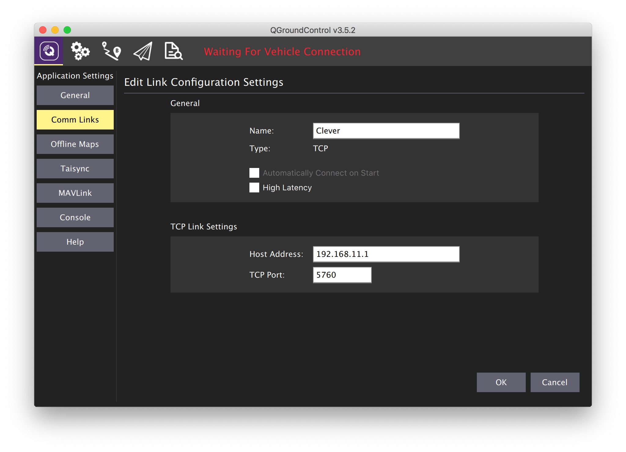 По умолчанию на Клевере настроена возможность подключения QGroundControl по протоколу TCP.